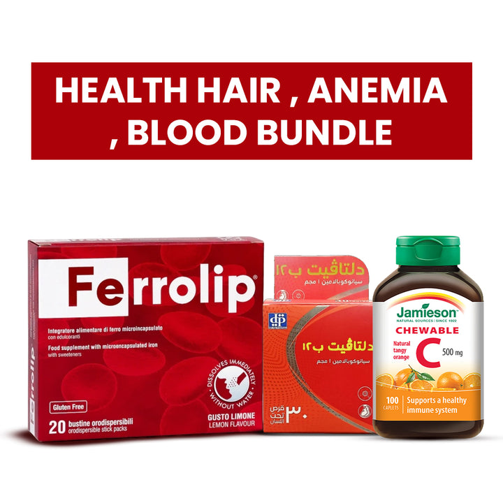 هذه الحزمة مخصصة لدعم صحة الدم ومعالجة حالات فقر الدم (الأنيميا)، مما ينعكس إيجاباً على صحة الشعر ومستويات الطاقة ودعم جهاز المناعة. تجمع الحزمة بين مكمل للحديد، مكمل لفيتامين B12، ومكمل لفيتامين C لدعم الامتصاص وتعزيز المناعة.